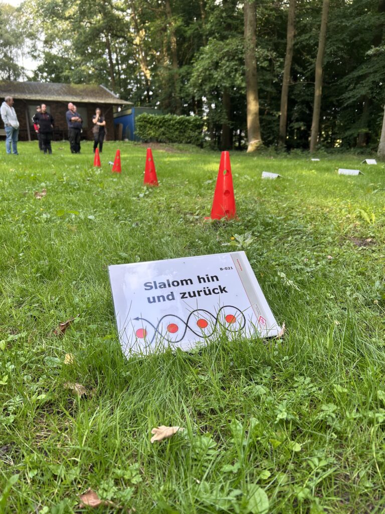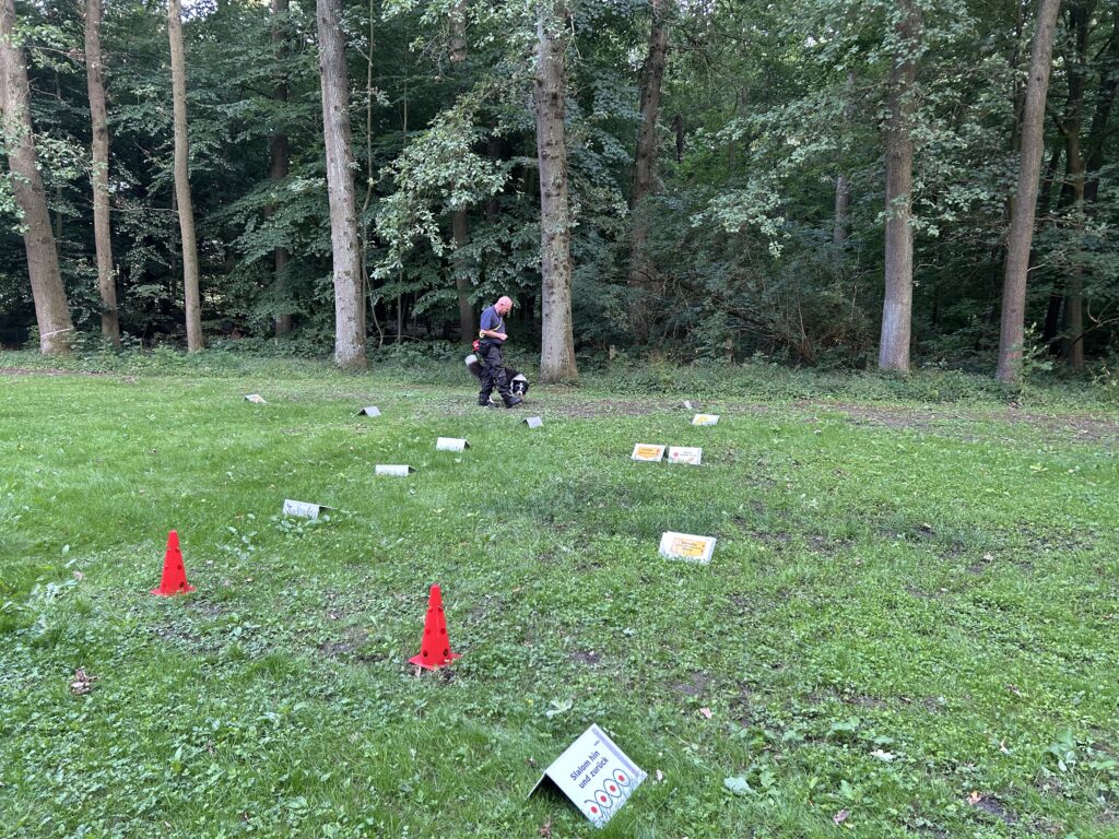 Rally Obedience ist ein Hundesport, bei dem Mensch und Hund gemeinsam einen Parcours mit verschiedenen Übungen absolvieren. Dabei stehen Kommunikation, Präzision und Teamarbeit im Vordergrund – Fähigkeiten, die für die Rettungshundearbeit essenziell sind. An jeder Station zeigt ein Schild, welche Aufgabe zu bewältigen ist – von klassischen Kommandos wie „Sitz“ und „Platz“ bis hin zu Richtungswechseln, Slalom oder Bleib-Übungen.
